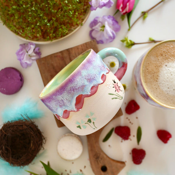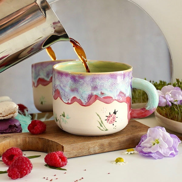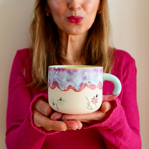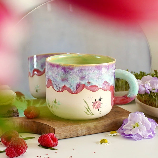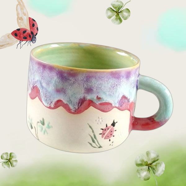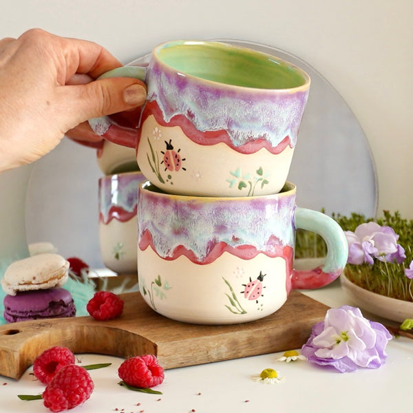 Ladybug er et sjarmerende krus i en myk pastellpalett av varm rosa, turkise toner og lys mintgrønn. Fargene smelter sammen i et lekent og harmonisk uttrykk som minner om vår, blomsterenger og solfylte dager.