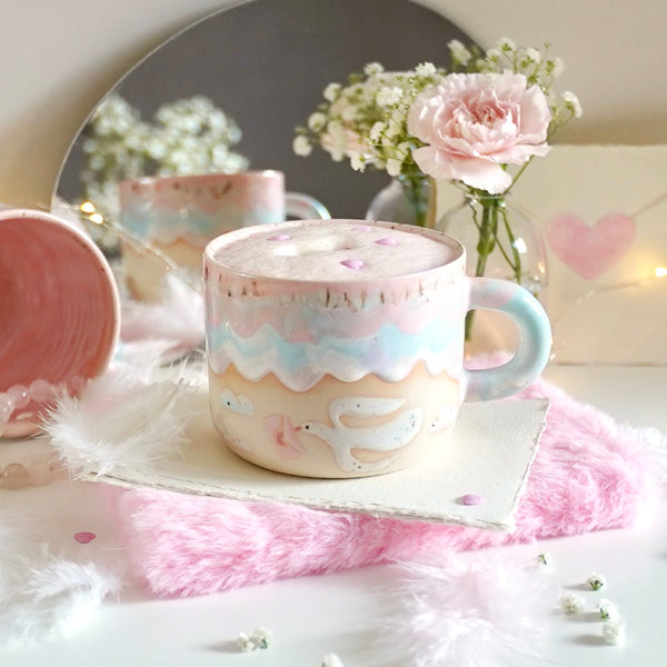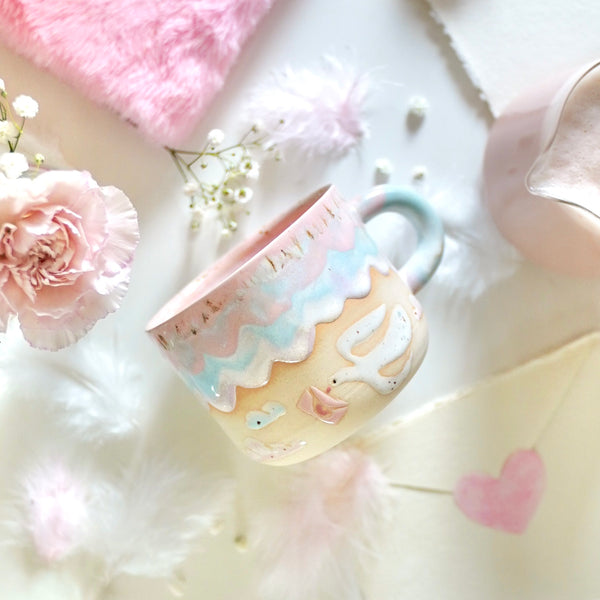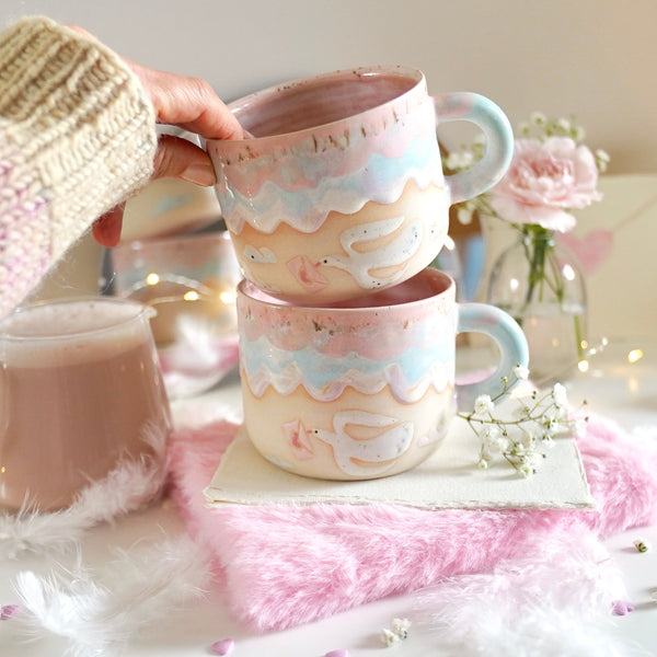 Opplev hygge i hver slurk med vårt håndlagde «Love Messenger» kosekopp. Dette unike kruset er nøye dreid og malt for hånd, med kjærlighet i hver detalj. Motivet viser en fredfull due som holder et lite kjærlighetsbrev i nebbet – en perfekt hyllest til kjærligheten på Valentinsdagen.